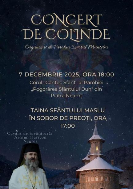 La Parohia Izvorul Muntelui din orașul Bicaz va avea loc, începând cu ora 18.00, un concert de colinde susținut de corul „Cântec Sfânt” al Parohiei „Pogorârea Sfântului Duh” din Piatra Neamț. Evenimentul îl va avea ca invitat special pe Arhim. Hariton Negrea, care va rosti un cuvânt de învățătură cu acest prilej.